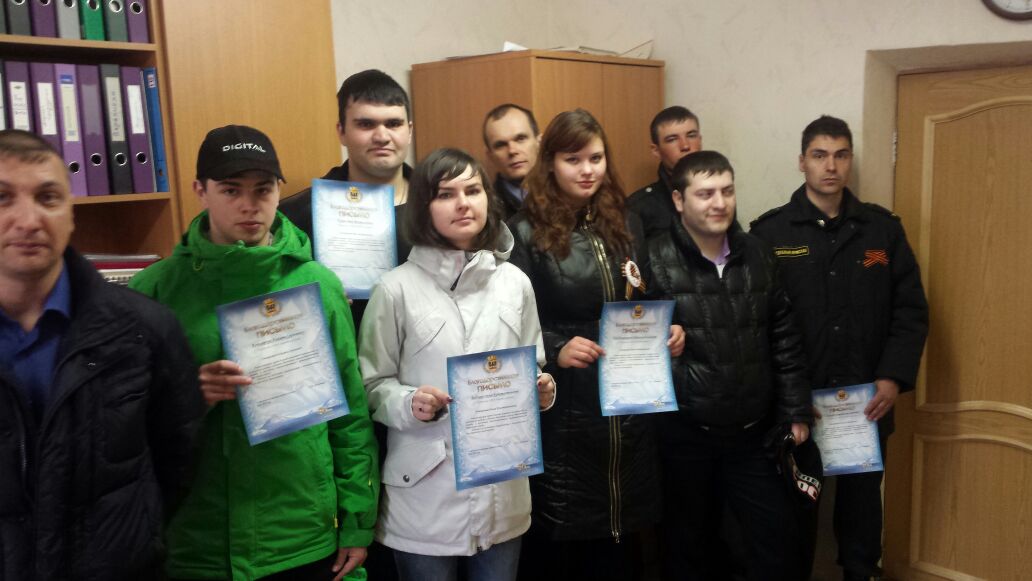 Дата: 2015-05-08 6 мая 2015 года дружинники ЕРОО «Народная Дружина» были награждены благодарственными письмами Администрации города Елизово. Награждены были Анисимов Николай, Анисимов Алексей, Бабенко Ольга, Борисов Иван, Шахов Ярослав, Папян Ваге, Исмаилов Магомед, Зубаков Андрей, Голубятникова Инна, Салиев Георгий, Колайдо Григорий, Котлярчук Никита, Ротарь Тимофей, Максимов Николай. В письмах Администрация выразила благодарность за проделанную работу в области обеспечения охраны общественного порядка и пересечения административных правонарушений.
