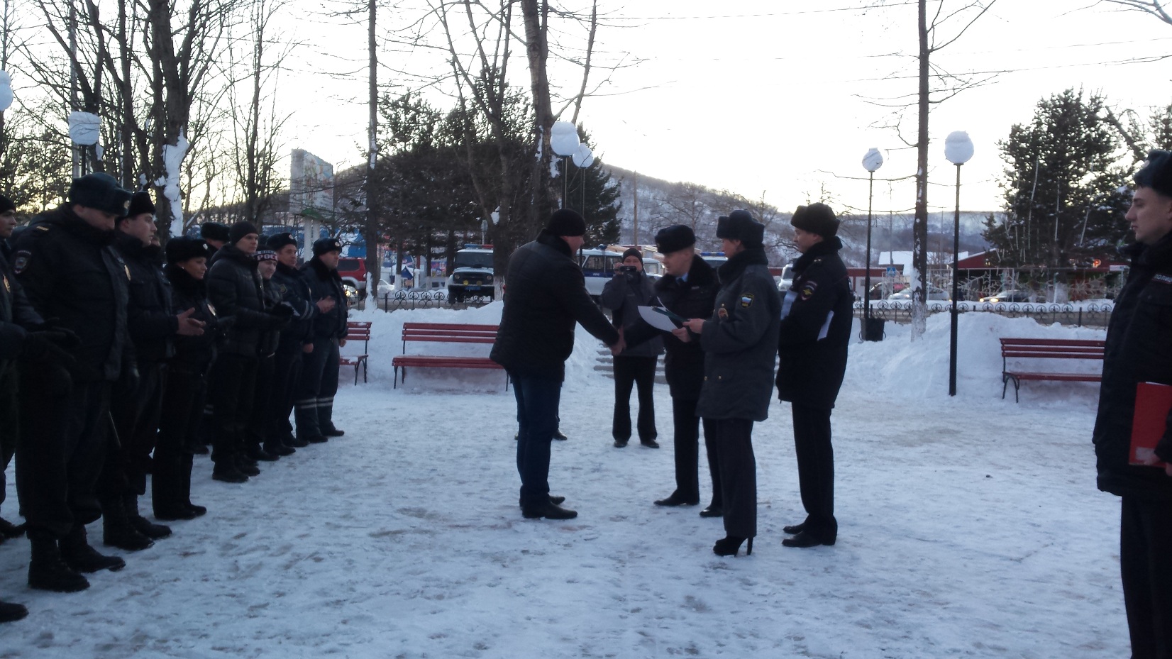 29 декабря 2014 на площади г. Елизово был проведен гарнизонный развод сотрудников полиции заступающих на охрану общественного порядка. В гарнизонном разводе кроме сотрудников полиции приняли участие и сотрудники Народной Дружины Елизовского района.