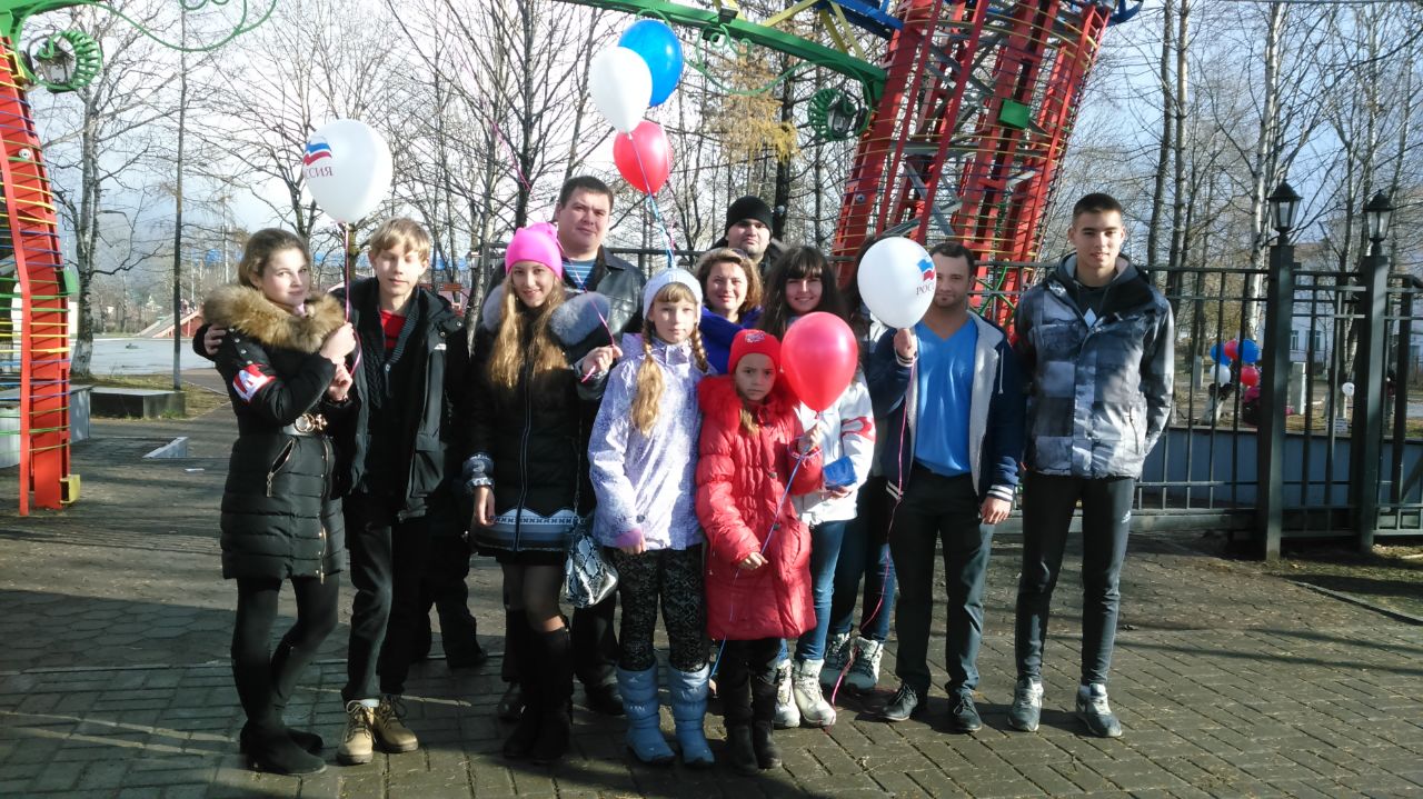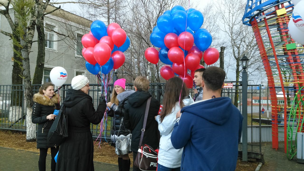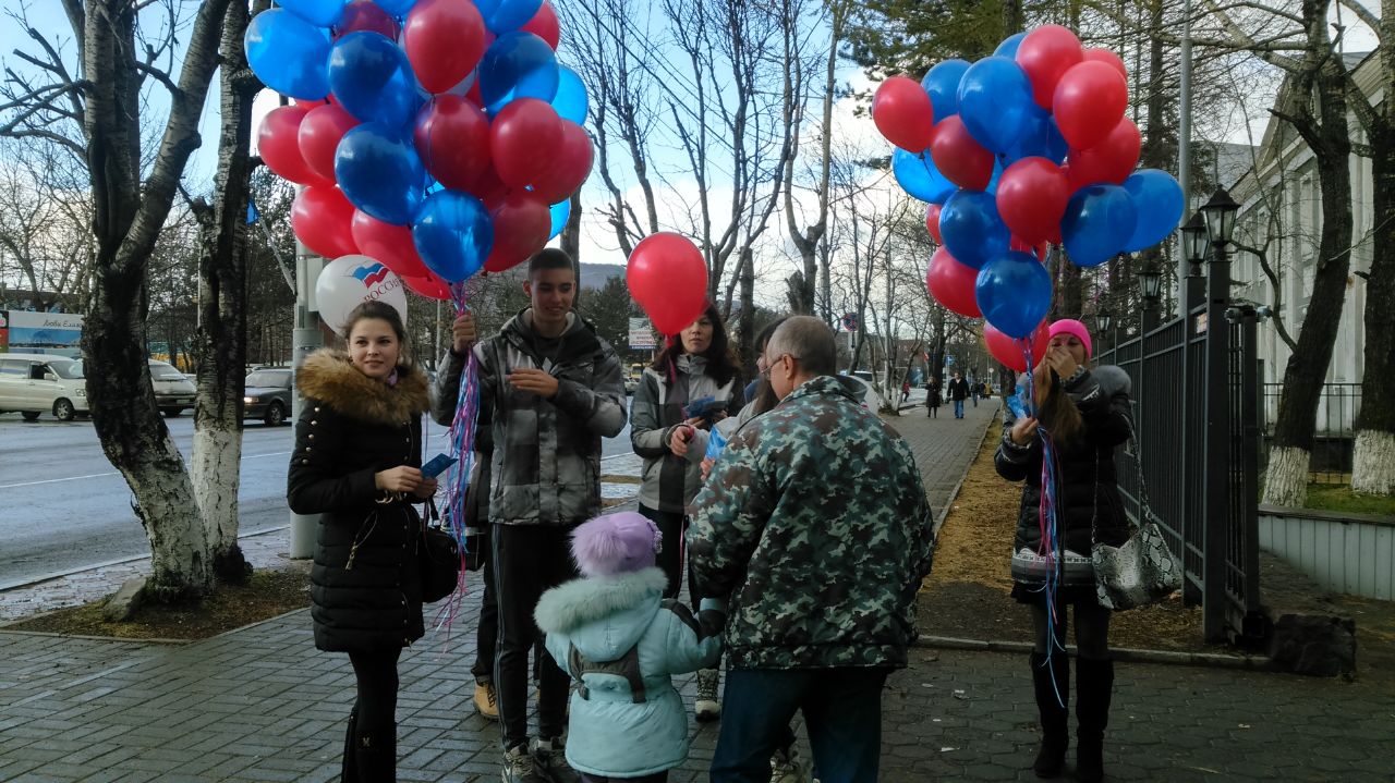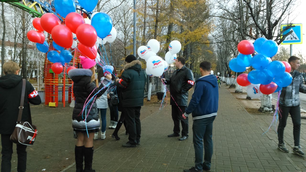 Дружинники ЕРОО «Народная Дружина» и елизовские молодогвардейцы поздравляли жителей и гостей города Елизово с праздником, рассказывали о его истории, и в знак единения народов дарили прохожим воздушные шары цветов российского флага и конфеты.